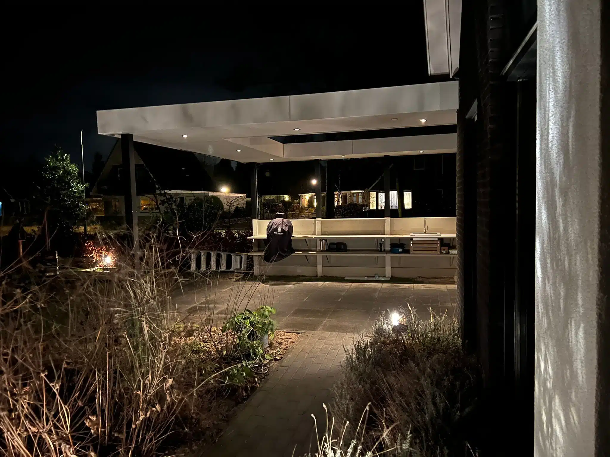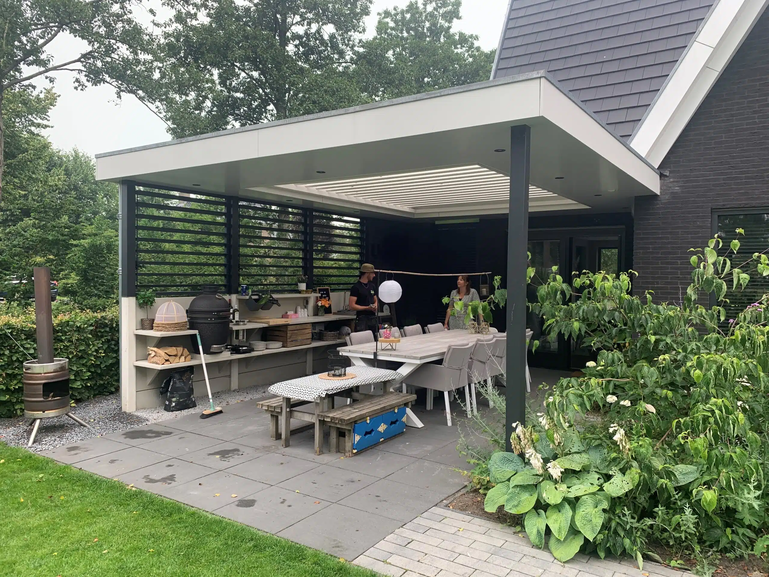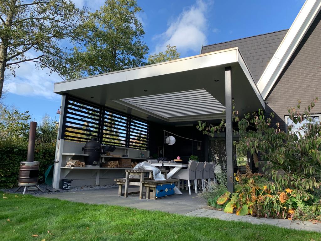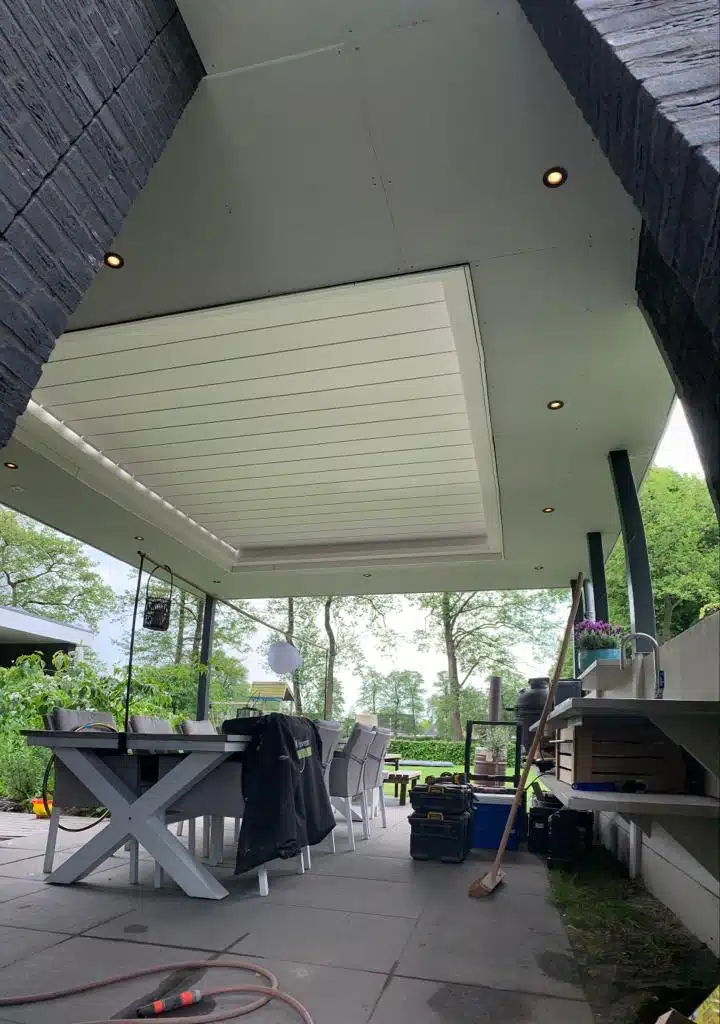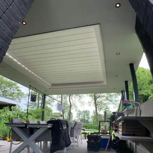 In Marum is een maatwerk tuinoverkapping compleet ontwerpen en gebouwd in stijl van het huis. Hierdoor sluit de overkapping naadloos aan op de woning. De overkapping is afgewerkt met lamellen, die automatisch dichtgaan bij lichte regenval. De complete overkapping is afgewerkt met strakke platen en verlichting. Op deze manier kunnen de bewoners ook in de avonduren en bij regenval relaxen onder de overkapping.
